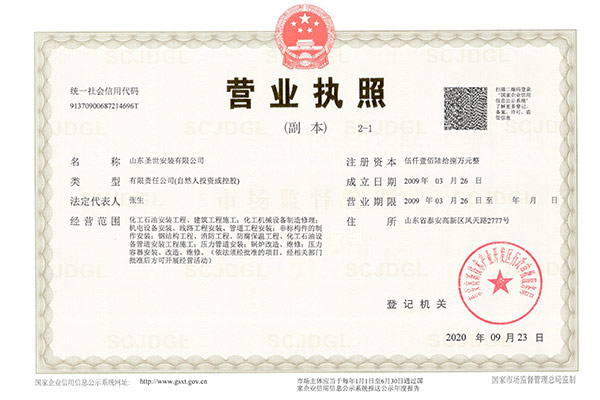 山東圣世安裝有限公司于2009年3月26日正式成立,注冊資金5168萬元。法定代表人:張生。注冊地址:山東省泰安高新區鳳天路2777號。經營地址:山東省泰安高新區鳳天路2777號。經營范圍:化工石油安裝工程、建筑工程施工;化工機械設備制造修理;機電設備安裝、線路工程安裝、管道工程安裝;非標構件的制作安裝;鋼結構工程、消防工程、防腐保溫工程、化工石油設備管道安裝工程施工;壓力管道安裝;鍋爐改造、維修;壓力容器安裝、改造、維修。